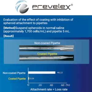 The Low Cell Attachment Pipette and Centrifuge Tube are treated with Prevelex, a biomaterial attachment prevention coating agent developed by Nissan Chemical Corporation.